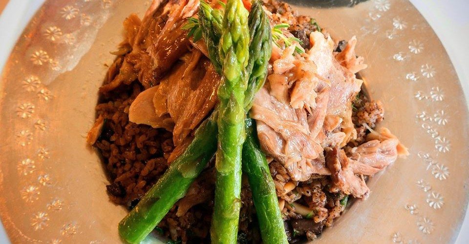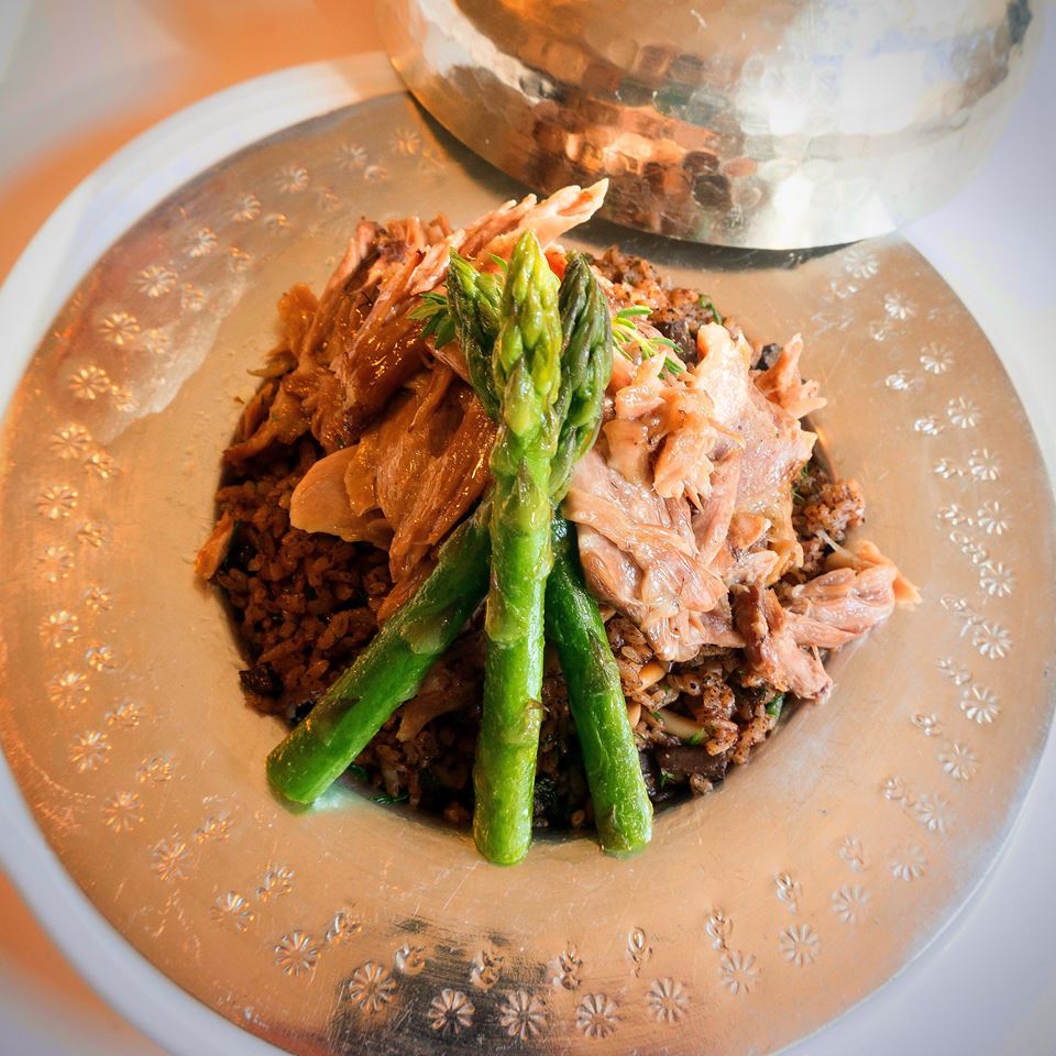 Oven roasted baby goat kebab. Served with fragrant rice pilaf with herbs.